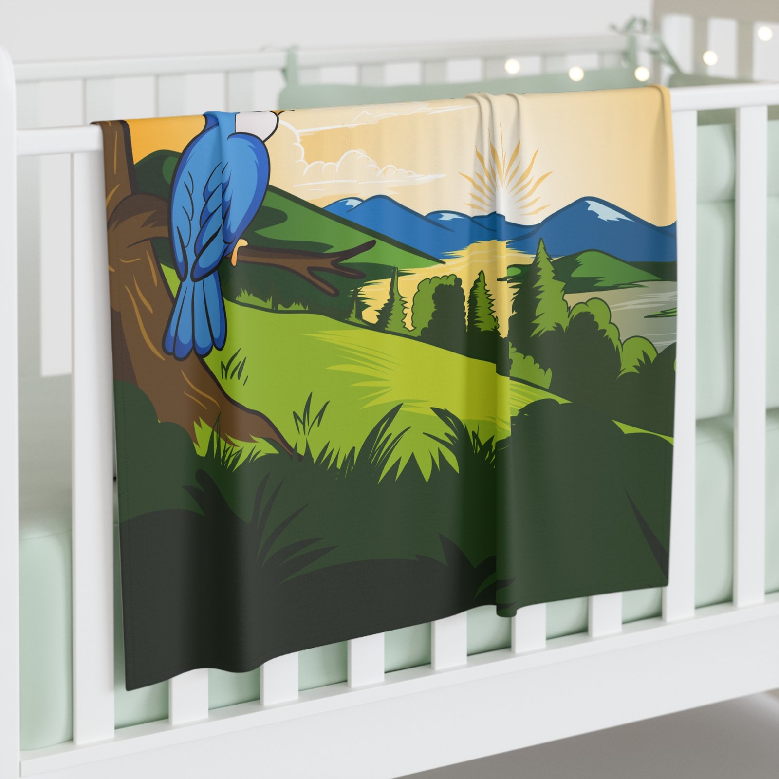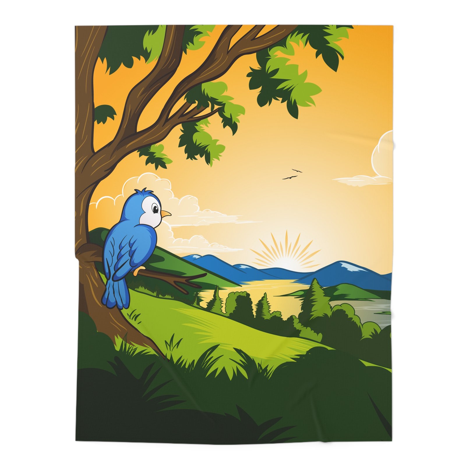 This soft baby swaddle blanket wraps newborns in a gentle, sunset-kissed scene. A calm blue bird perches beneath a leafy tree, watching rolling green hills and a warm golden sky as the sun rises. Lightweight and smooth, the blanket drapes easily for swaddling, nursing cover, stroller use, or tummy-time on the floor. The one-sided, vibrant print keeps the illustration bright and clear. It feels cozy against delicate skin and brings a quiet, nature-centered mood to nursery moments — morning feeds, peaceful naps, and slow stroller walks at dawn.